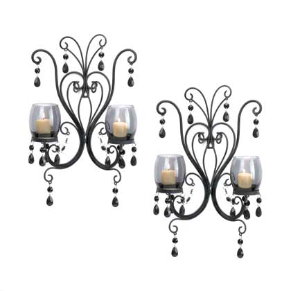 • Dark and mysterious, this pair of wall sconces will turn candlelight into a dramatic lighting accent with two smoked glass candle cups set in a scrolling black metal frame.