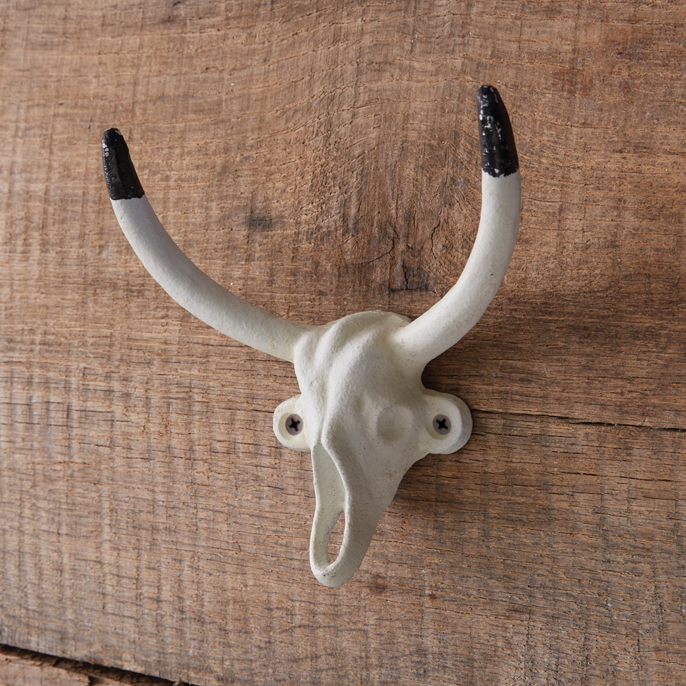 Organize your space with a western touch with this bull hook. It features two horns to hang things from and a painted finish. Bull is made of cast iron. To hang, use its two screw holes.