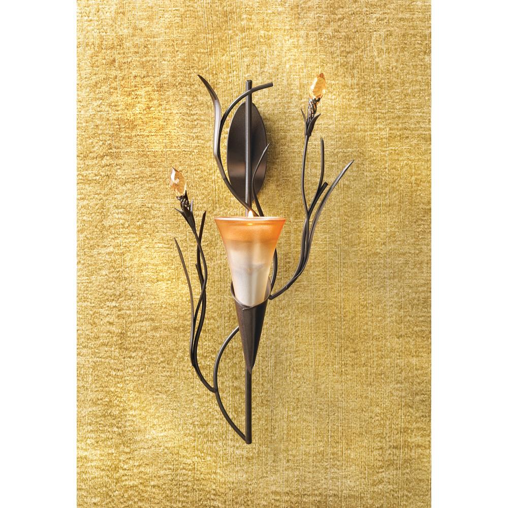 • A delicate sunrise orange lily blossom, twining vines, and crystalline buds makes for colorful wall decor. With the addition of your favorite tealight candle or LED, this wall sconce becomes a stunning combination of ornate sculpture and glowing light!