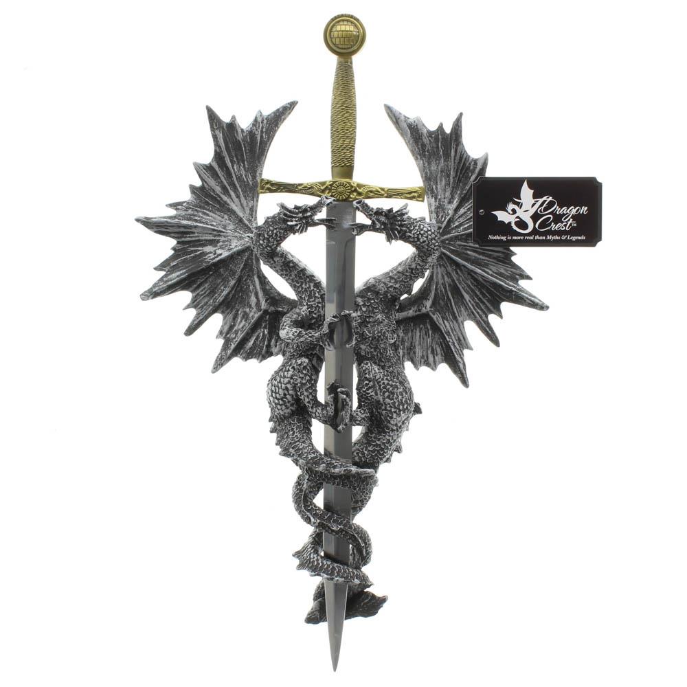 • An impressive display of medieval mythology, as a pair of dragons entwine around a formidable dagger. Turn any room into a medieval fantasy castle with this mythical wall decor!