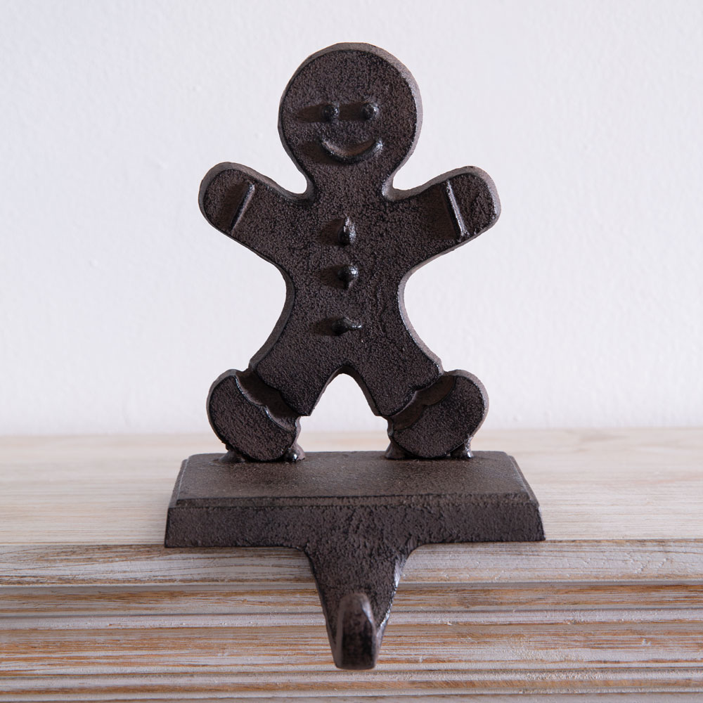 Give your mantel a rustic touch this holiday season with our Gingerbread Stocking Holder. Item is made of cast iron. Holds a normal sized stocking.